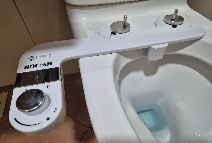 Place your HyJun Bidet on the toilet. Position the bidet and adjustment plates so that they line up with the holes on the toilet bowl.